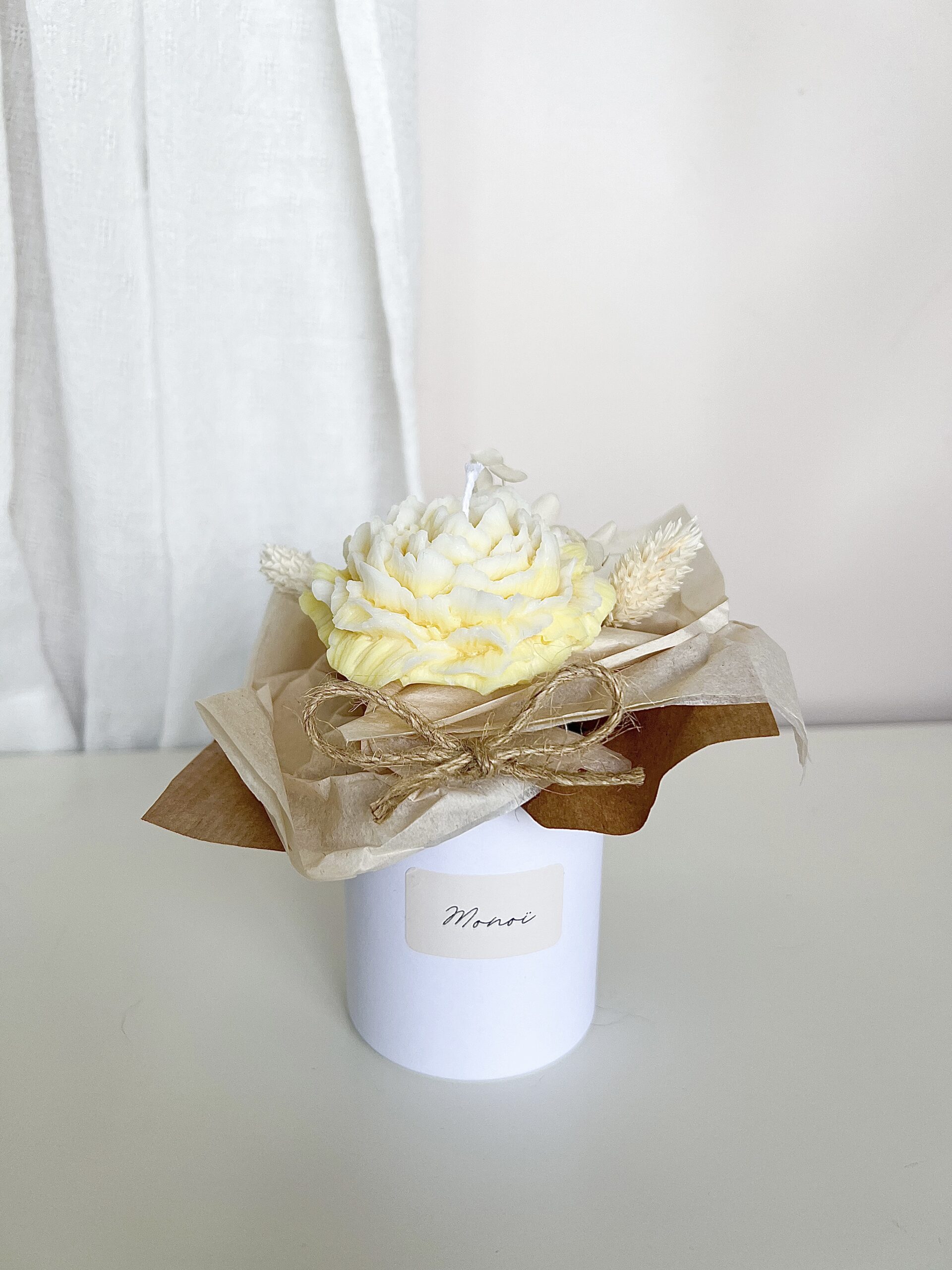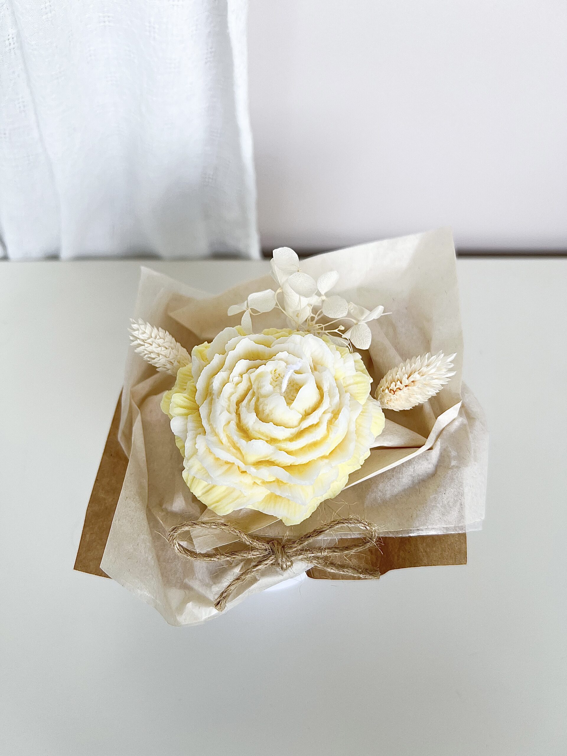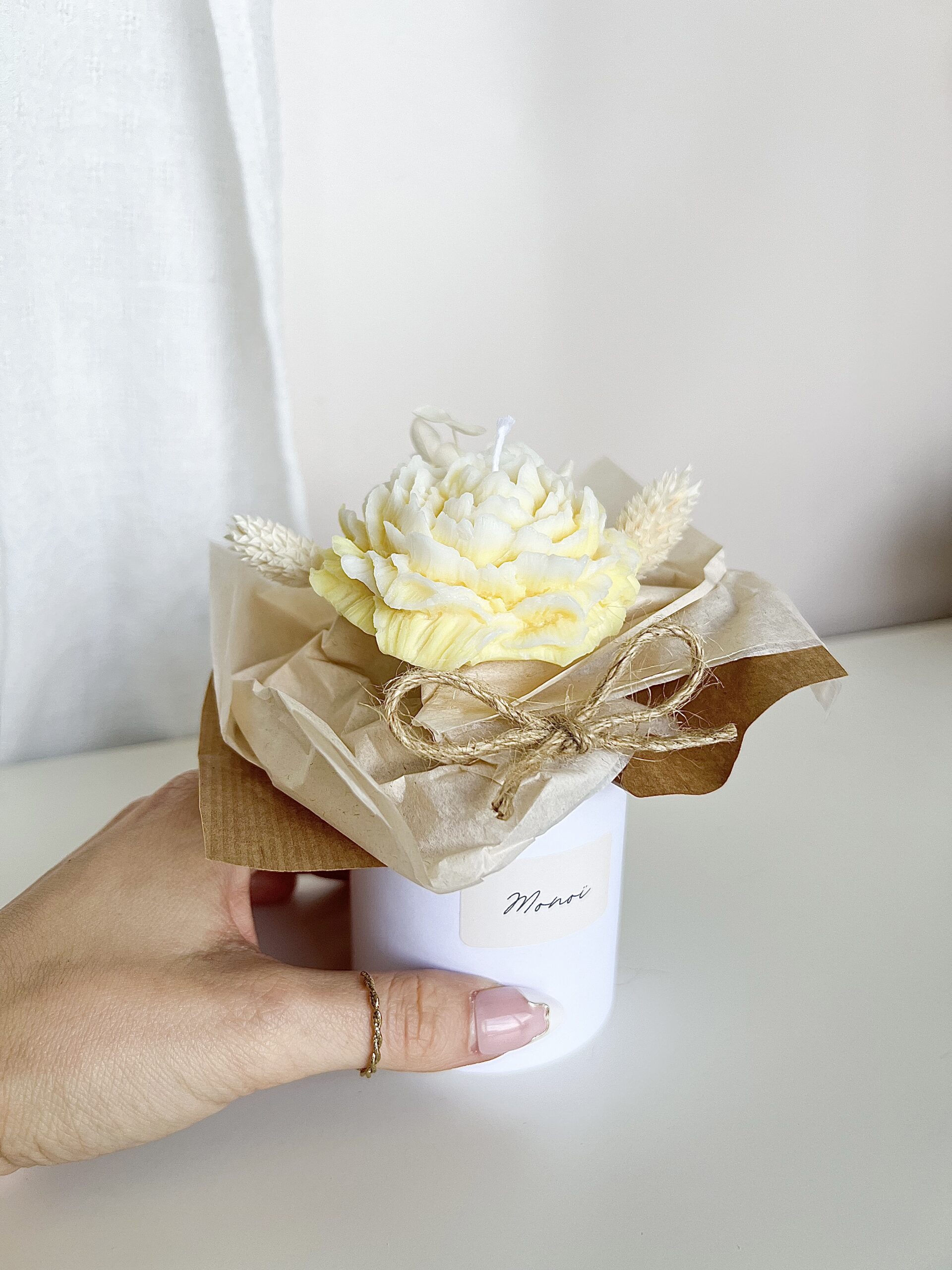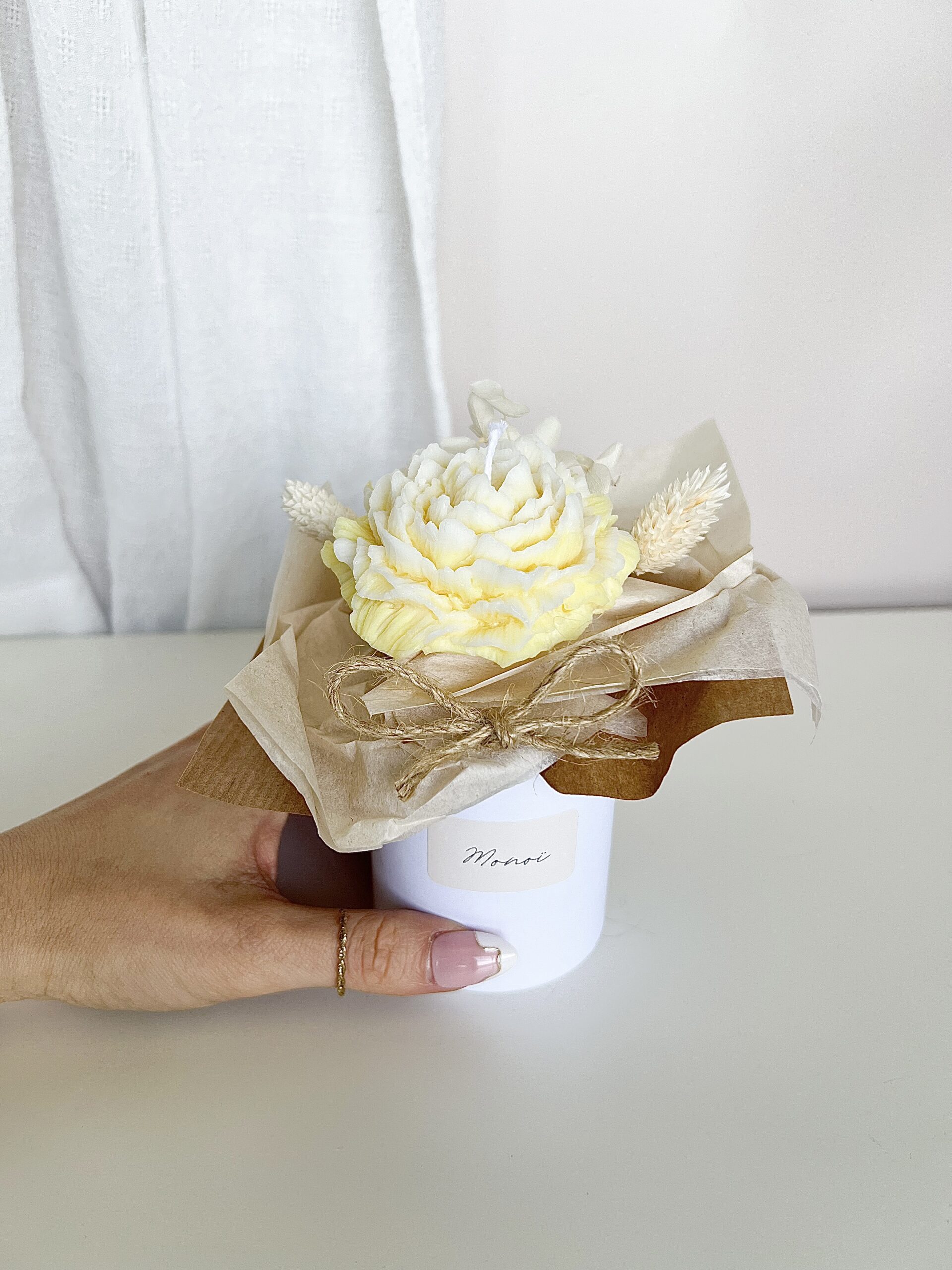 Apportez une touche de poésie et de douceur à votre intérieur avec ce charmant bouquet de bougie parfumée. Façonné à la main avec soin, chaque détail imite parfaitement une véritable fleur, mêlant l’élégance d’une pivoine givrée agrémentée de brins de fleurs séchés…